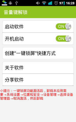 软件介绍: 彻底解放你的电源键!安装后绝对会成为你手机中最常用的软件! 启用软件后即可使用手机音量键实现快速解锁屏幕,解锁后可以直接操作,不会再出现解锁界面,方便快捷。 软件还附带“一键锁屏”功能,启用后会在桌面创建一键锁屏快捷方式,点击即可锁定手机!