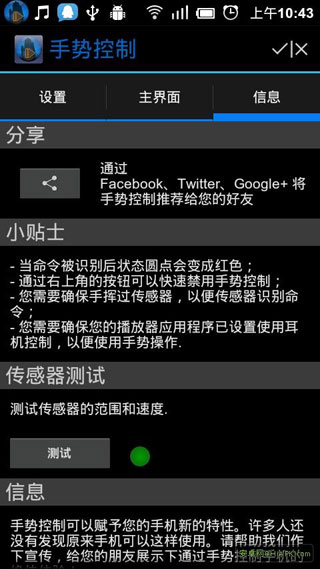 软件介绍: Wave Control Pro是一款能通过一些简单的手势来控制手机做一些事情,比如播放歌曲,切换音乐等! 演示视频:http://v.youku.com/v_show/id_XMzg2MzczNjg4.html 常见的用途: +在驾驶时更容易控制 +在办公室 +在健身房 +厨房 +每当你的手太脏触摸您的手机 +魔术招术,用来哄女孩。 +更多