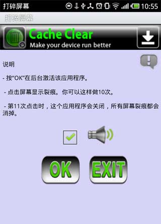 软件介绍: 一款打碎屏幕的整蛊工具。 说明: 按"OK”在后台激活该应用程序; 点击屏幕显示裂痕,你可以这样做十次; 第十一次点击时,应用程序会关闭,所有裂痕都会消失。