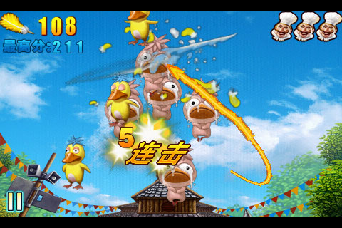划动手指切动物,被划中的动物会把动物的毛划掉,然后你就可以得到相应的分数。时间模式,你有三条生命,如果你漏掉一个动物,你的生命就会减一,但是如果你可以在一百分内不再失去另外的生命的时候,你是会获得一个生命的奖励的,但重要的是要小心混在动物中的炸弹哦,一旦你划中一个炸弹,你就生命就会耗完,游戏也会结束了。经典模式,在这个模式下是没有生命和炸弹的,所以你就大胆放心去划就可以了,但会有时间限定,在限定的时间内你划的越多动物,得分就越高。